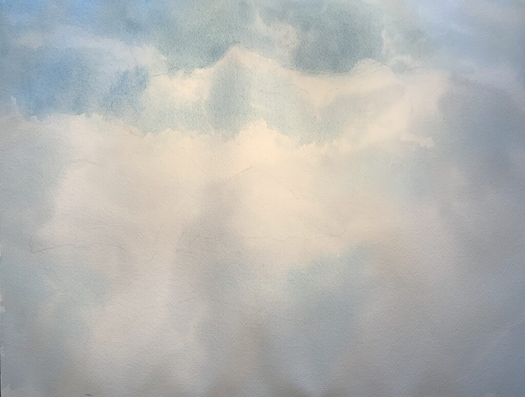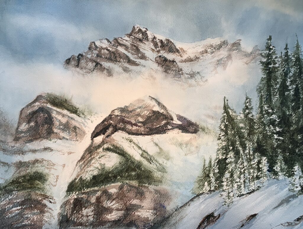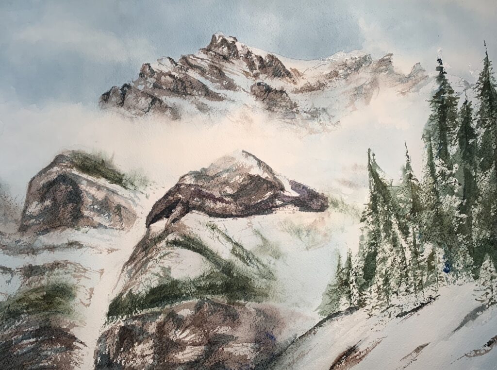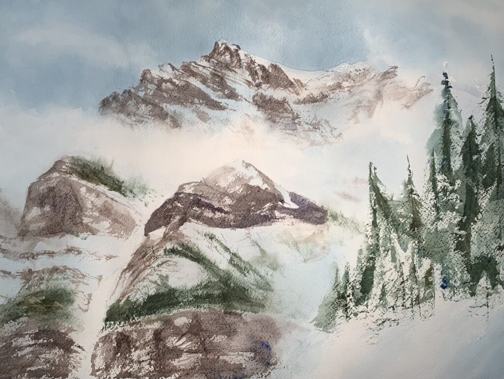 Enjoy these progression photos of my latest mountain landscape, Cloudy Cascades. The full painting and description is here in my Canadian Wilds gallery.