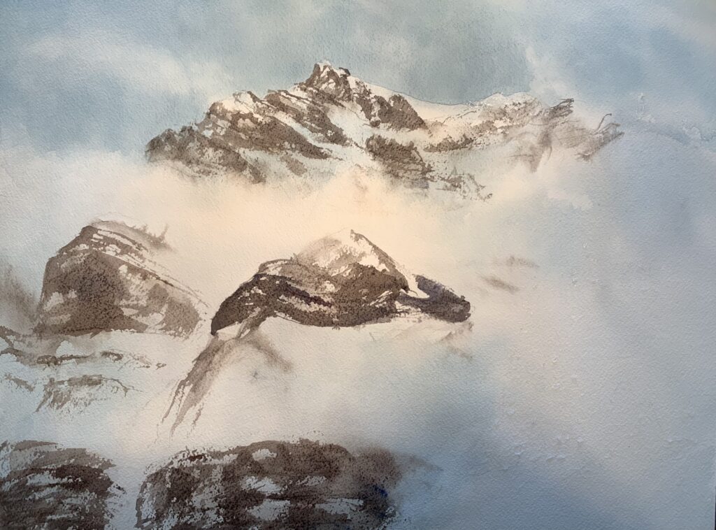 March 29, 2026Enjoy these progression photos of my latest mountain landscape, Cloudy Cascades. The full painting and description is here in my Canadian Wilds gallery.